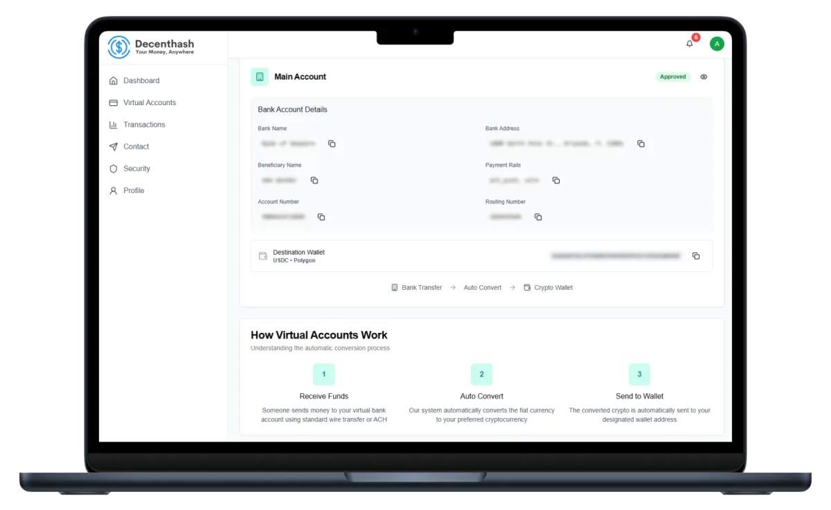Sign up for an account, complete our KYC verification process, and you'll be able to create virtual accounts for receiving payments and converting to cryptocurrency.